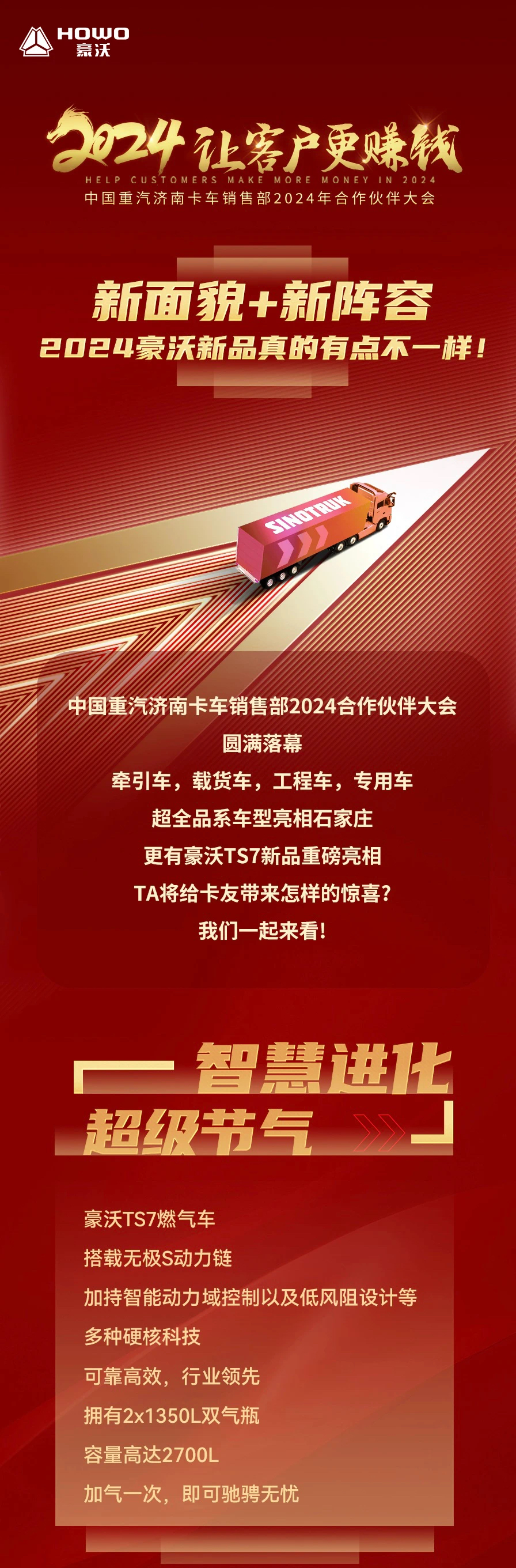 中國重汽濟南卡車銷售部2024合作伙伴大會圓滿落幕。牽引車,載貨車,工程車,專用車,超全品系車型亮相石家莊,更有豪沃TS7新品重磅亮相,TA將給卡友帶來怎樣的驚喜?我們一起來看!