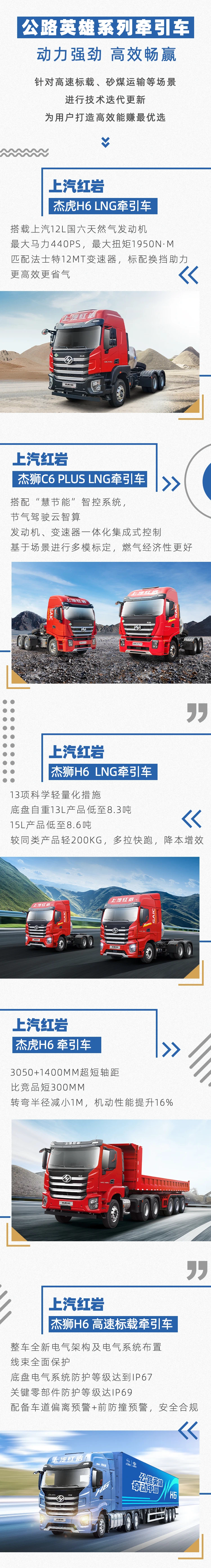 2024年度車型品鑒會,上汽紅巖牽引、工程、載貨專用以及新能源車型集體亮相,覆蓋高速標載、砂煤運輸、城建渣土、港口運輸等多個細分場景,全方位展現出上汽紅巖的強大產品實力,每個車系我們都為大家選出幾款代表車型以供大家品鑒