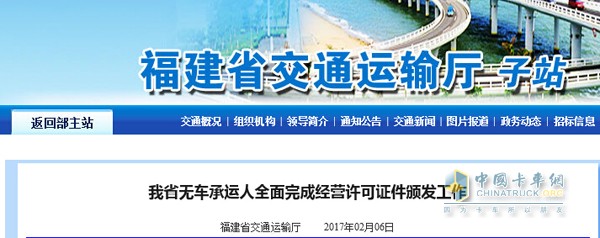 福建:無車承運人全面完成經營許可證件頒發工作