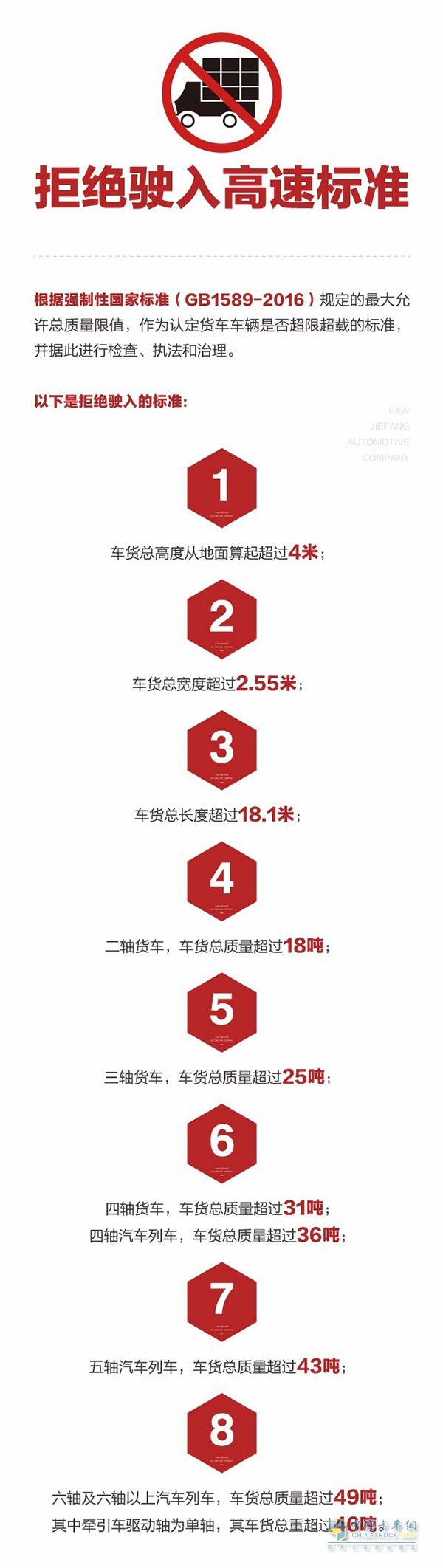 以上是本網整理出的部分省份的治超舉措,同時本網為大家奉上拒絕駛入高速的標準列表,僅供大家參考,避免發生不必要的麻煩。