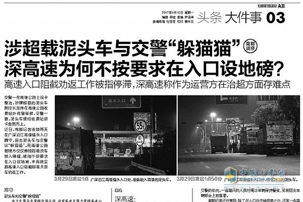 近日,記者連續兩天在廣深沿江高速福永入口蹲守,目擊泥頭車與交警玩“躲貓貓”。而高速公路管理方僅懸掛超載貨車禁入橫幅,被指不按要求在入口設地磅,未有效實施高速入口阻截超限大貨車勸返工作。2017年4月10日,廣深沿江高速深圳段運營方深高速回應稱,近期將在廣深沿江高速福永收費站入口加裝計重設備。