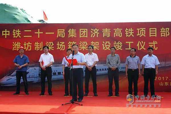 2017年5月19日,隨著最后一孔重達800噸的32米箱梁穩穩落在濰坊北站東咽喉處,濟青高鐵控制性工程——總長16.23公里的跨榮濰高速公路特大橋全面合龍,至此由濰坊梁場承建的濟青高鐵八標段472孔箱梁制運架施工任務全部完成,用時僅四百余天。至此由中鐵二十一局集團承建的濟青高鐵8標段線下工程全部拉通,全面進入無砟軌道施工階段,標志著濟青高鐵建設取得重大節點突破。