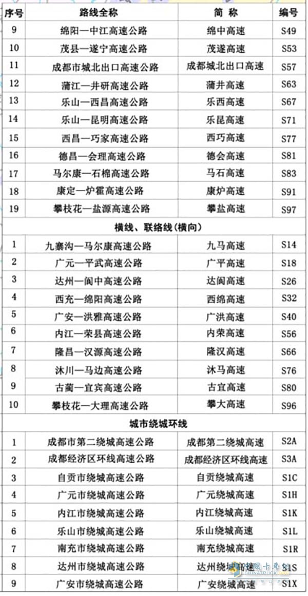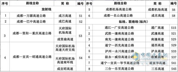 (1)成都放射線。編號為一位數,由正北開始按順時針方向升序編排,編號區間為1~9。如“成萬高速”是成都正北方對外輻射的第一條放射線,編號為“S1”。