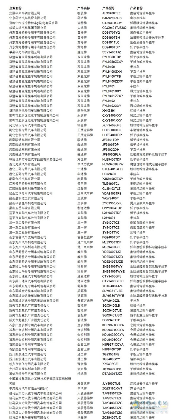 其中福建省富亞龍掛車制造有限公司共有11款車型需整改,涉及車型包括廂式運(yùn)輸半掛車,平板自卸半掛車、集裝箱半掛車等。