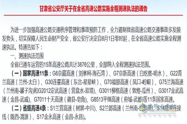 甘肅省高速公路全程測速執法通告