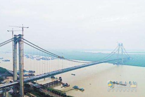 杭瑞高速洞庭湖大橋是杭瑞高速公路臨湘大界至岳陽段關鍵控制性工程,位于洞庭湖入長江交匯口處的岳陽市七里山,大橋為雙塔雙跨鋼桁架梁懸索橋,全長2390米,主跨跨徑1480米,加勁鋼桁梁長1933.6米。大橋由湖南省交通規劃勘察設計院設計,湖南路橋建設集團有限公司與中交路橋建設有限公司承建。
