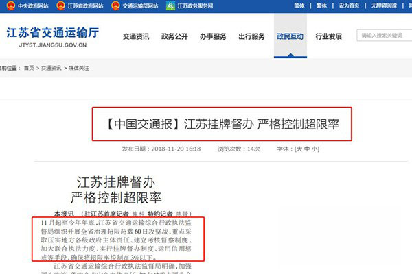 2018年11月---12月底,江蘇省交通運(yùn)輸綜合行政執(zhí)法監(jiān)督局將組織開(kāi)展全省治理超限超載60日攻堅(jiān)戰(zhàn),掛牌督辦,嚴(yán)格控制超限率在3%以下。江蘇省交通運(yùn)輸綜合行政執(zhí)法監(jiān)督局明確: