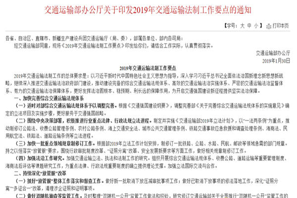 交通運輸部辦公廳印發《2019年交通運輸法制工作要點》