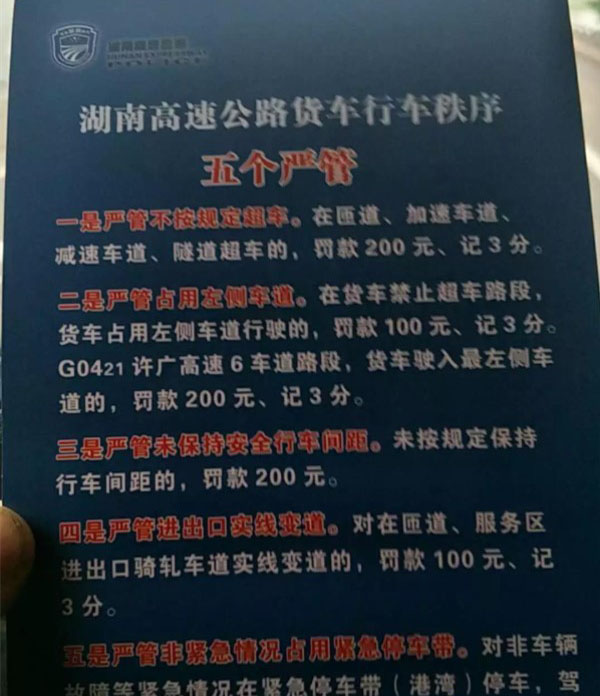 湖南省開始嚴厲整治高速公路貨車行車秩序,對于5類大貨車違規、違法的的駕駛行為作出明確規定,最低罰款100元,最高罰款200元并記3分。