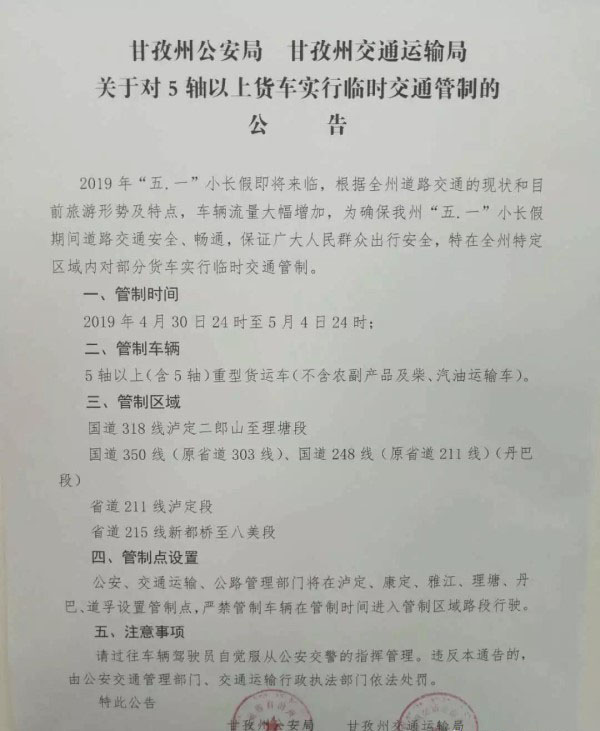 公安、交通運輸、公路管理部門將在瀘定、康定、雅江、理塘、丹巴、道孚設置管制點,嚴禁管制車輛在管制時間進入管制區域路段行駛。
