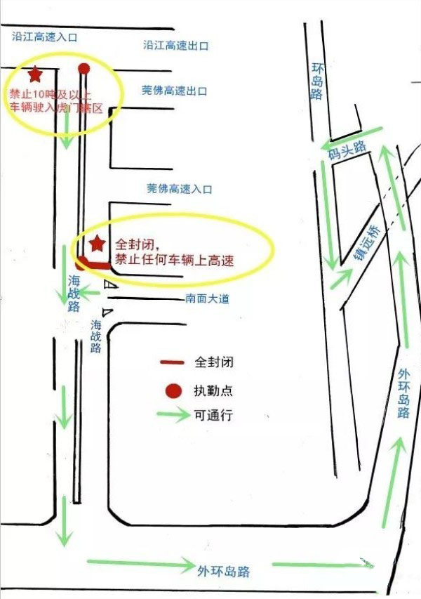 對(duì)虎門南面大道與海戰(zhàn)路入高速方向的交匯處實(shí)施全封閉,禁止所有車輛上莞佛高速及沿江高速。