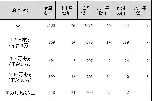 年末全國港口擁有萬噸級及以上泊位2520個,比上年增加76個。其中,沿海港口萬噸級及以上泊位2076個,增加69個;內(nèi)河港口萬噸級及以上泊位444個,增加7個。