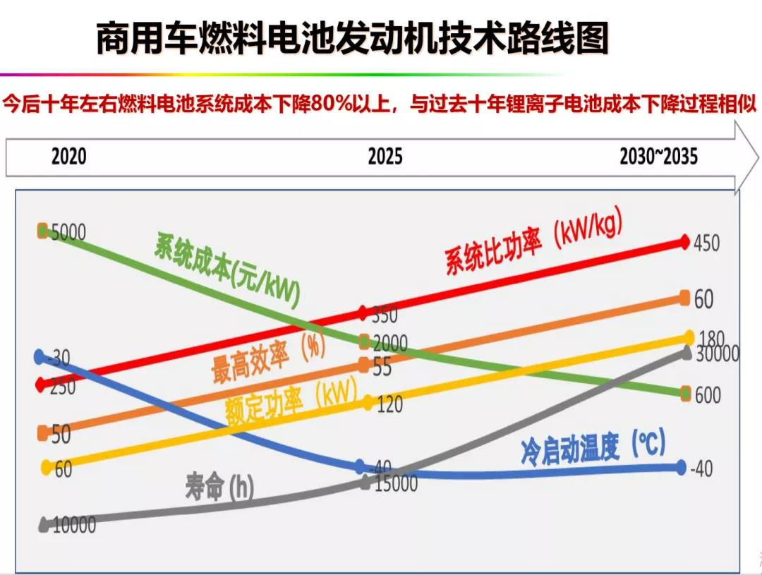 數據統計顯示現在的性能跟五年前相比,所有主要的性能指標都有大幅的提升,比如核心指標燃料電池壽命提升了300%。國產燃料電池零部件的產業鏈已經建立,系統集成能力大幅增強,頭部企業正在形成,這就是目前的狀態。下一步的重點就是要使燃料電池系統成本十年內下降80%以上。過去十年鋰離子電池就是這樣發展的,燃料電池滯后了十年。系統成本要從2020年的5000元/千瓦下降到2030年的600元/千瓦。