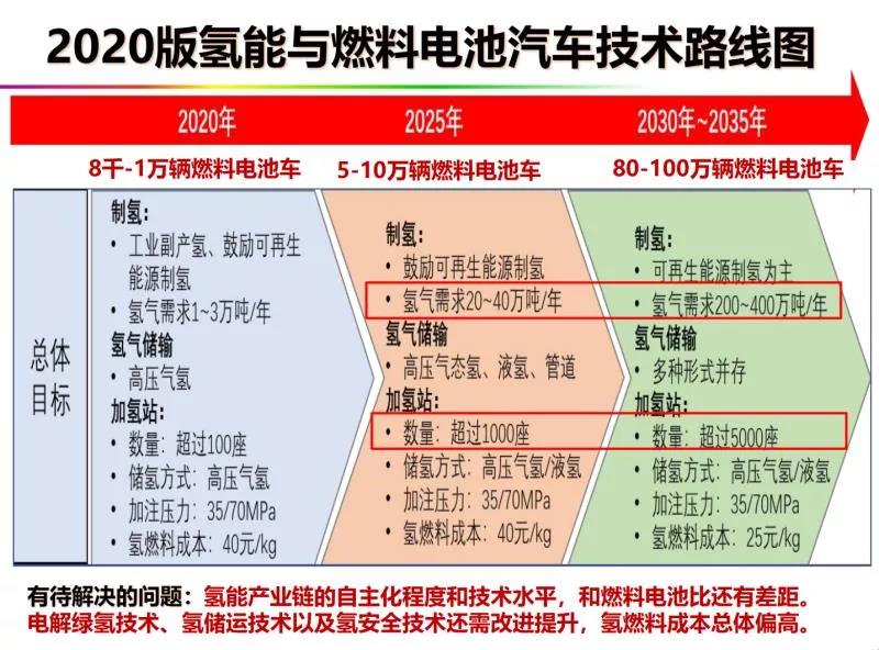 往前看氫能燃料電池的技術路線圖。2025年目標是推廣5-10萬氫燃料電池車;2030-2035年實現80-100萬輛應用規模,這都是以商用車為主體。在這個情況下,氫需求量到2030年大概三百萬噸左右,這個可能比我們預期的低。這還是按商用車為主體預測的,如果主要是轎車,幾十萬噸就夠了。但加氫站的數量可能比我們想象的要多。因為加氫效率比加天然氣要低,氫是最輕的一種氣體,只是天然氣密度的1/8。當前氫燃料電池汽車發展還面臨一些挑戰,比如說氫燃料產業鏈自主化程度與技術水平和燃料電池還有差距,電解綠氫技術、氫儲運技術、氫安全技術還需要改進提升,氫燃料的成本總體偏高,這是今后5-10年必須努力解決的。