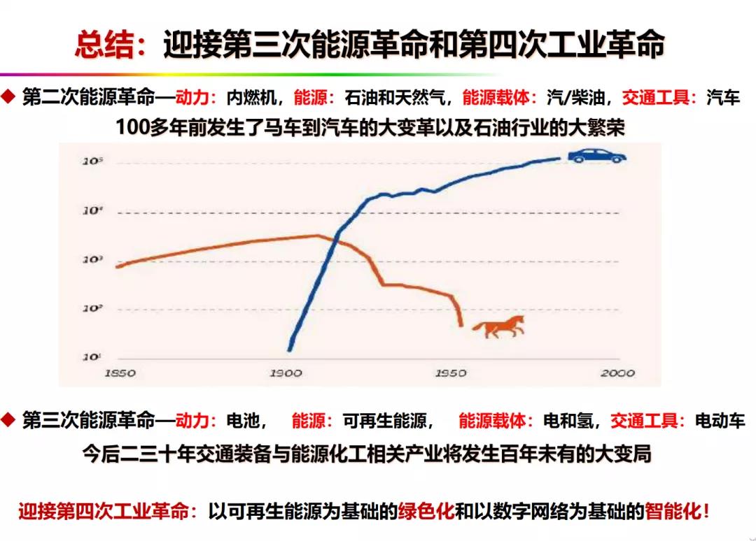 最后我做一個總結——迎接第三次能源革命和第四次工業革命。一百多年前的第二次能源革命引發了馬車到汽車的大轉型和石油行業的大繁榮。主要的轉型期從1900年開始,大概經歷了25年左右?,F在第三次能源革命就在眼前。我估計與上次馬車到汽車的轉變類似,今后二三十年交通裝備與能源化工相關產業將發生百年未有之大變局。讓我們共同迎接第四次工業革命,也就是以可再生能源為基礎的綠色化和以數字網絡為基礎的智能化。