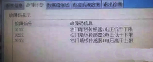 故障分析:根據(jù)診斷儀檢測(cè)的故障碼,使用專用萬用表檢測(cè)油門線電壓,診斷儀給出的三個(gè)故障碼都是油門踏板傳感器電壓?jiǎn)栴},初步判斷是機(jī)油壓力傳感器的內(nèi)部短路導(dǎo)致的油門踏板電壓不對(duì),拔掉機(jī)油壓力傳感器后測(cè)量,電壓穩(wěn)定,更換機(jī)油壓力傳感器后加油正常,故障排除。