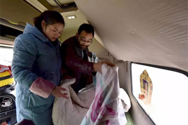 張師傅與其妻子收拾駕駛室