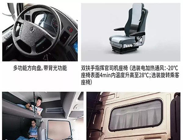 在駕駛室內,用戶可以選擇多功能方向盤(帶背光功能)、雙扶手指揮官座椅帶加熱功能、旋轉乘客座椅、可抽拉式下臥鋪(寬度可達1米)、駕駛室的LED頂燈、駕駛室后窗、駐車空調等多種人性化舒適性配置。