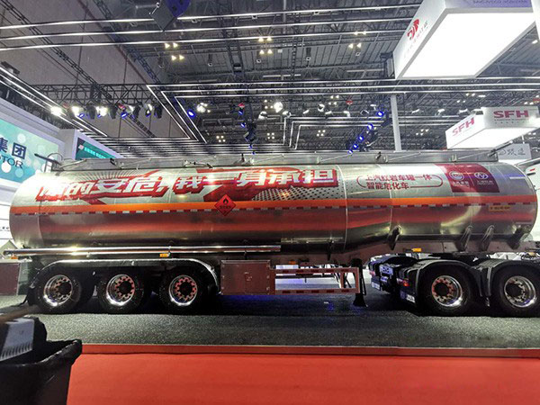 在整個展廳燈光的映射下,這款上汽紅巖杰獅C50e智能危化車銀光閃閃,格外惹眼,因為無論是輪轂還是掛車都采用鋁合金材料,大約5.5噸的掛車設計進一步提升整車載荷量。