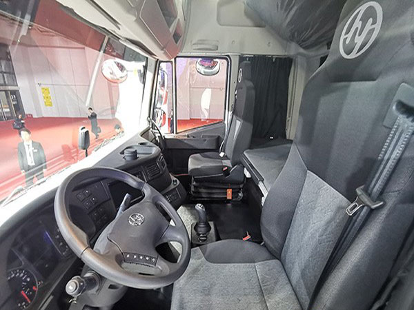 來到主駕駛位置一顆DMS疲勞駕駛預警系統攝像頭也格外顯眼,掛車尾部的滅火器實用而方便。