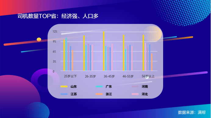 數據顯示,山東、廣東、河南、江蘇、浙江、河北進入不同年齡段的司機數量前5,這些地區經濟強、人口多。中國有幾大物流之鄉,來自山東、河南、安徽和河北,當地農業發達,眾多農村人口加入貨運行業。而滿幫發布的數據顯示,司機排名靠前的省份不乏蘇、浙江、廣東這些發達地區。無論哪個年齡段,“山東大漢”都位列榜首。