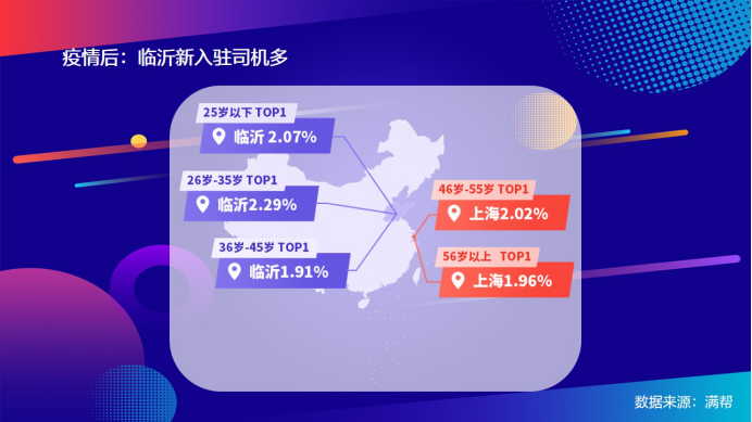 疫情對物流線上化帶來了很多改變。從疫情后新入駐用戶來看,山東臨沂成為入駐司機最多的地級市,年齡集中在45歲以下。司機行業有著“群聚效應”、“帶動效應”強的特點,加之當地有非常充沛的蔬菜資源,運輸需求大。