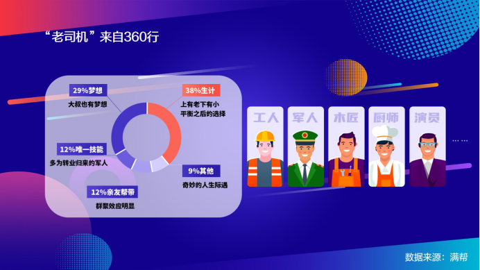 疫情后,運輸行業更是吸納了眾多轉行人群,他們中有工人、木匠、廚師,甚至是演員、飛行員,使得卡車司機群體畫像更加多元化。滿幫做為平臺型企業,具有較強的包容性,提高了需要轉行、有相關技能人群的就業靈活度。